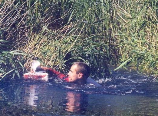 В положении оговорено, чтобы на ФИНИШ вернулись байдарка, два члена экипажа, две карты и одна карточка, на которой компостером на КП делаются отметки. Некоторые КП стоят на суше (т.е. обычная призма, как в "настоящем"ориентировании). И тут возможны варианты - обойти остров одному из участников на байдарке, а второму "взять" КП и выйти к противоположному берегу и там сесть в свою байдарку или вдвоем перенести байдарку через остров (попутно "взяв" КП). Поэтому нередки такие "картинки" - два человека несутся по суше с байдаркой в руках или по пояс в воде проводят байдарку через камыши. Короче - приезжайте, посмотрите, поучаствуйте - прокат байдарок имеется.