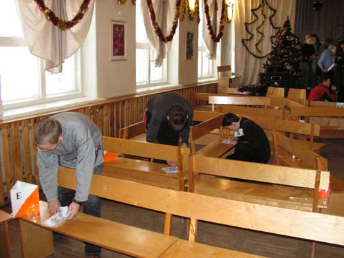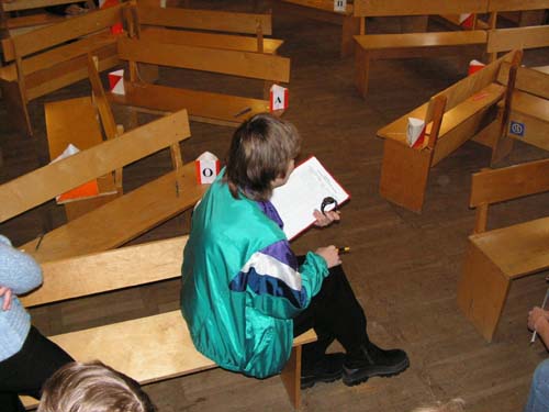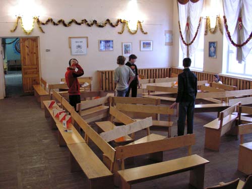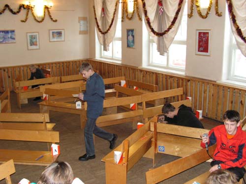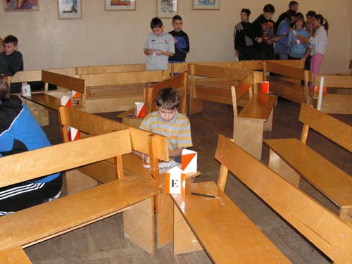 Местом для проведения соревнований был выбран актовый зал центра, где организаторы с помощью скамеек организовали «местность» и поставили КП. На сцене было решено размещать участников, что бы те не толпились в проходах. Система отметки заслуживает особого внимания – на каждой призме была написана буква, которую участник записывал в свою карточку фломастером, лежащим возле каждого КП. Дистанция состояла в среднем из 13 КП, а её протяжённость была не более 40 метров.