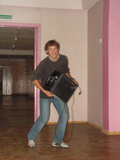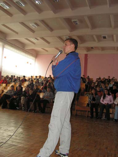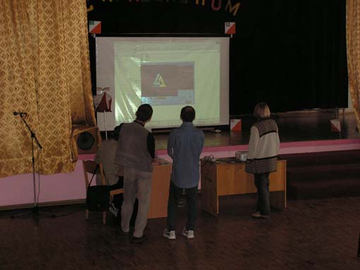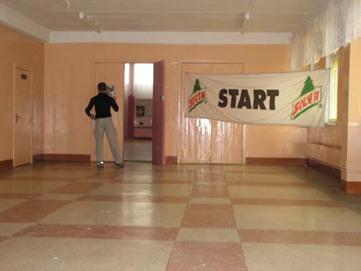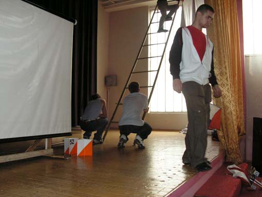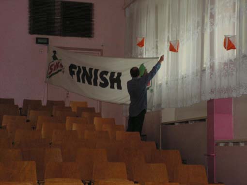 Специально для этой О’презентации были смонтированы несколько слайд – шоу, с фотографий соревнований и подобран неплохой видеоряд. Помещением был выбран актовый зал школы на 180 мест, а так же мы получили всю необходимую аппаратуру – компьютер, музыкальный центр (усилитель), ну и конечно цифровой проектор. Немного повозившись, всё удалось неплохо настроить и протестировать. Мало того весь зал был украшен «по – ориентировщицки». В прихожей импровизированный «волчатник» из оградительных лент и огромное полотнище «СТАРТ». Сам же зал был завешен огромным количеством призм и компостеров, а угол зала логически украшало полотно «ФИНИШ». До начала акции любопытствующих, в буквальном смысле слова, приходилось просто выталкивать из зала.