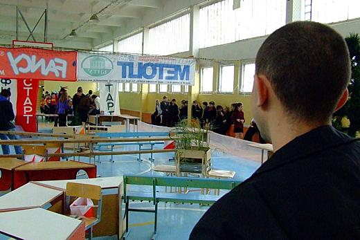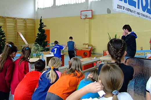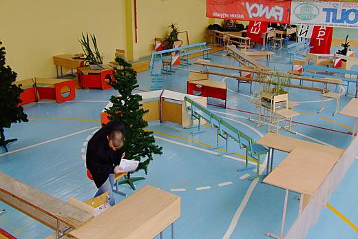 День для устроителей начался в 10.00. Именно в это время был назначен сбор всех причастных к организации в холле школы. Собралось около 8 человек (всего же нас было около 15) и вся бригада двинулась в спортзал, где уже ждал, заготовленный накануне вечером, ландшафт. Зайдя в зал я был слегка поражен. Было здорово! Правда! Я не ожидал таких лабиринтов. На местности было даже несколько деревьев – искусственные новогодние ели (в которых ваш покорный слуга имел неосторожность впоследствии и заблудиться). Оставалось всё только приготовить и настроить аппаратуру. Люди продолжали прибывать, а удивление персонала школы и учеников всё росло и росло. Отчетливо читался вопрос в глазах, когда они видели в помещении школы незнакомых людей, суетливо снующих по коридорам. Особо нетерпеливые и любознательные все – же решались спросить, мол, что здесь будет. А вот действительно, можно ли объяснить абсолютно неосведомленному человеку о том, что здесь будет, одной фразой, проходя мимо? Для меня этот вопрос открыт до сих пор.